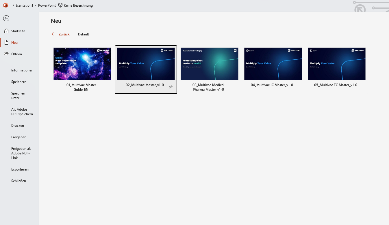 The MULTIVAC master template can be found directly in MS PowerPoint via New -> MULTIVAC Sepp Haggenmüller SE & Co. KG -> Default.