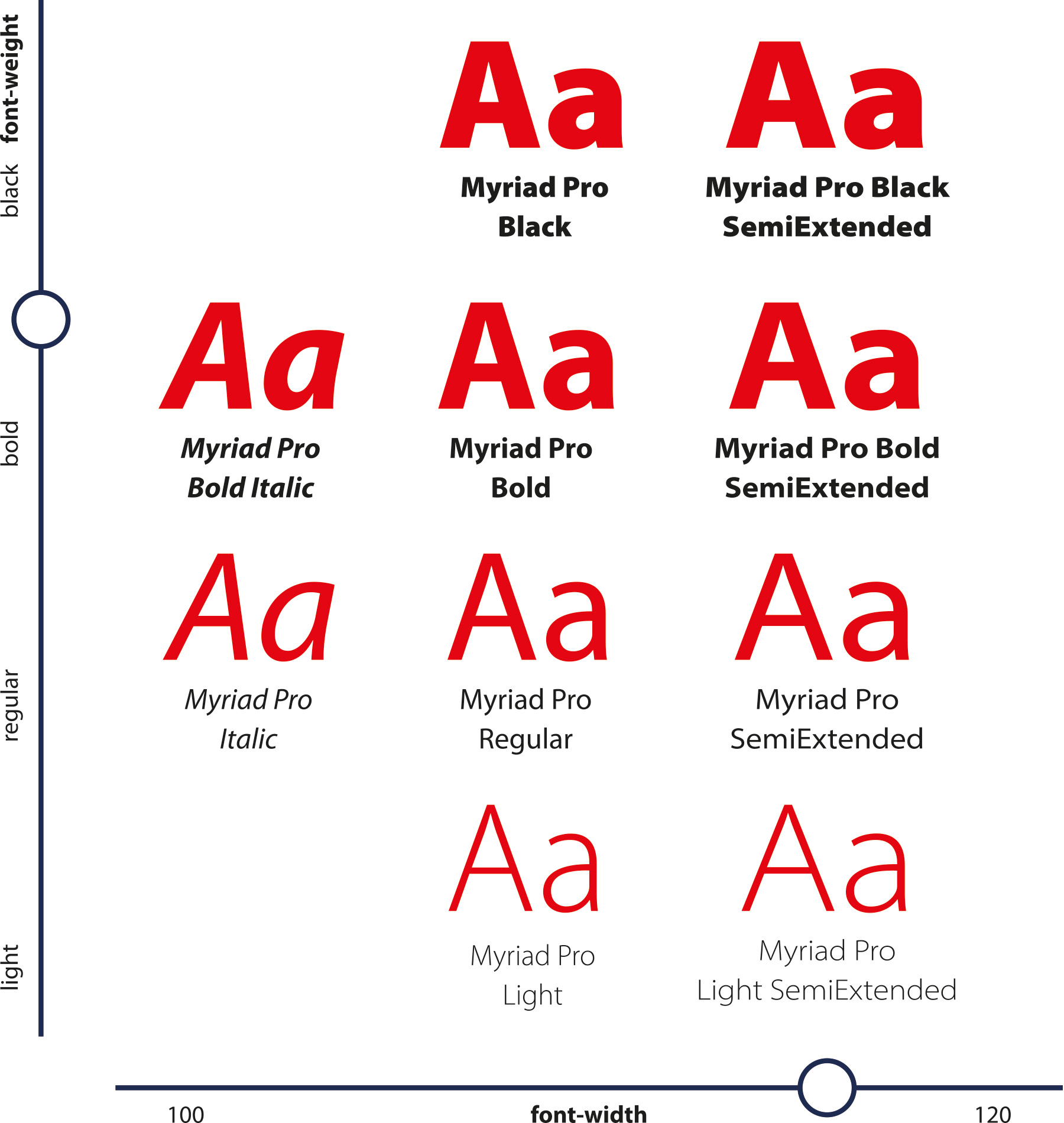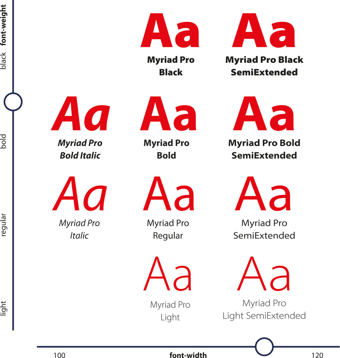 Il Myriad Pro è un font con peso e larghezza infinitamente variabili. Questa caratteristica speciale crea le basi per un uso flessibile. La tipografia può essere personalizzata in base ai requisiti, al contesto o al messaggio di un'applicazione. Ad esempio, il carattere Myriad Pro nelle applicazioni digitali è molto poco ingombrante grazie alla flessibilità della larghezza dei caratteri, in quanto offre la possibilità di orientarsi alla larghezza dell'area visibile (il viewport). La leggibilità e i contrasti possono essere migliorati regolando la dimensione dei caratteri e nelle animazioni il carattere Myriad Pro libertà creativa.