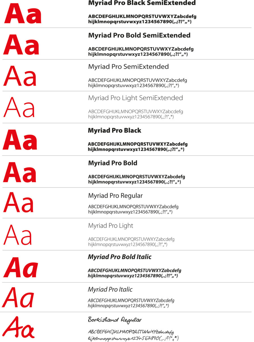 Audace e forte o ridotto ed elegante: gli stili dei caratteri del Myriad Pro consentono un'ampia varietà di presentazioni e atmosfere. Le applicazioni concrete sono quindi ancora più coerentemente orientate al gruppo target e ai rispettivi messaggi.